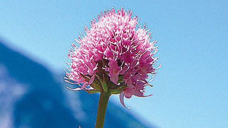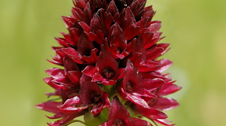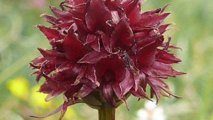 Die dunkelbraunroten Blüten des Österreichischen Kohlröschens liegen in einem halbkugeligen Blütenstand.