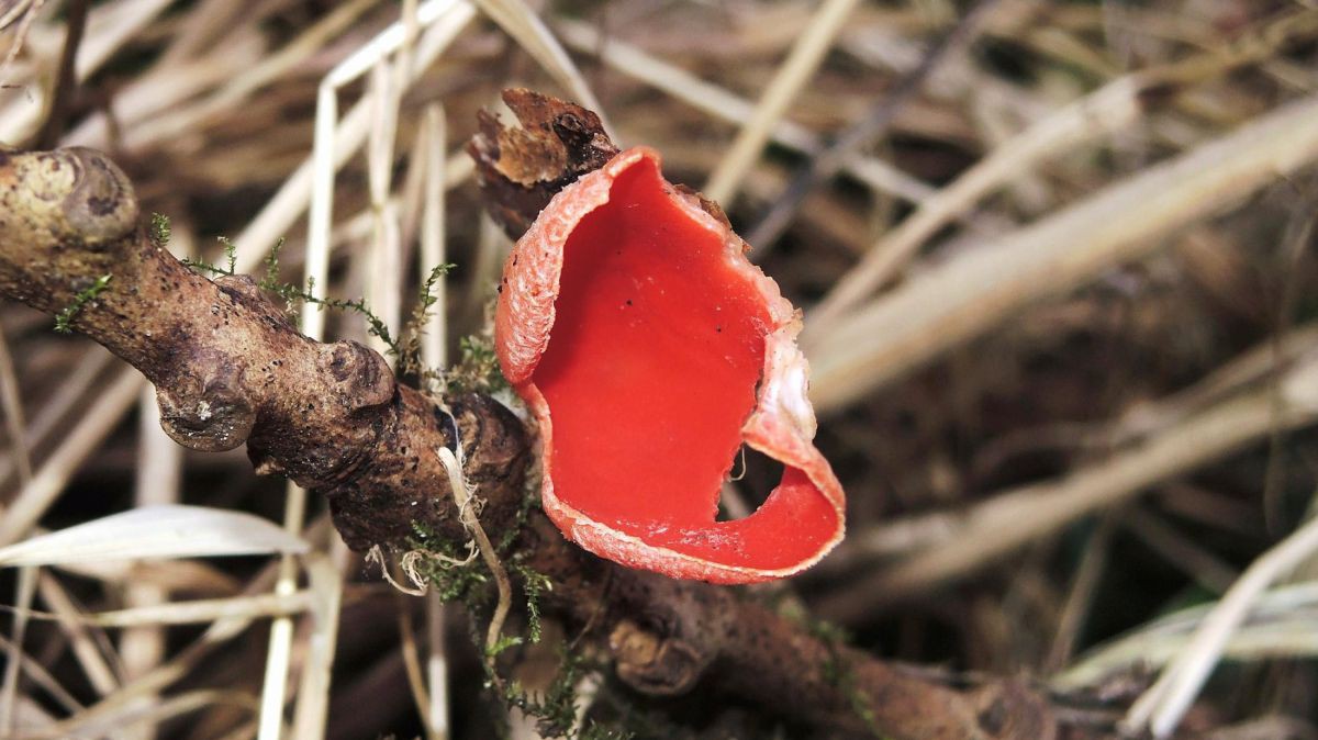 Der scharlachrote Kelchbecherling wächst an den Ästen von Laubbäumen.