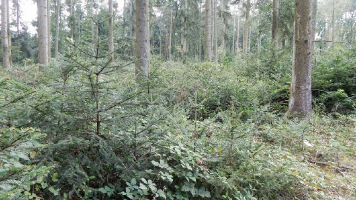 Auch in einem Wald mit Rotwildbestand konnte eine gut funktionierende Naturverjüngung umgesetzt werden. Das Wild hat durch großzügige Wiesenstreifen neben den Forstwegen genügend geschützte Äsungsfläche und lässt so den Jungaufwuchs der Waldbäume weitgehend in Ruhe.